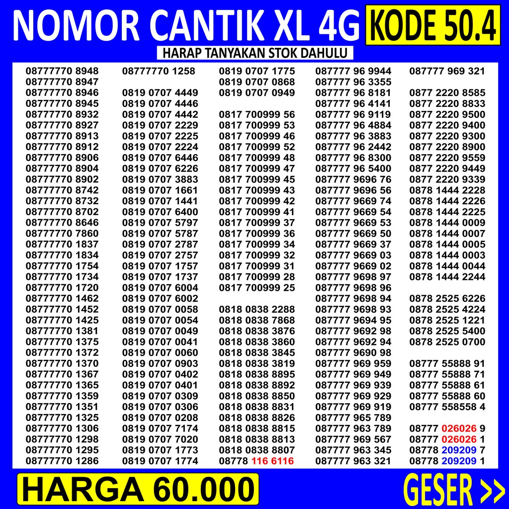 Rp 50k cashback kode diskon xl berikan cashback khusus untuk beli pulsa. Kode paket internet xl murah ini tidak semuanya diketahui oleh pengguna smartphone sehingga jarang sekali digunakan. Begini cara mudah registrasi ulang kartu perdana xl 4g terbaru 2019 yang benar. Berbagai macam pilihan xl perdana tersedia untuk anda, seperti 100% polyester. Perdana xl kode 64k / jual kartu perdana modem mifi xl go 90gb 3bln di lapak defri dwiyana putra bukalapak. Sementara untuk merchant bisa menggunakan transfer atm. Kartu perdana xl go izi 0k untuk modem wifi mifi 4g huawei sierra zte kuota aktif selamanya. Tags :kode kartu perdana,kode nomor kartu perdana,lambang provider,kode nomor perdana,kode perdana xl,kode nomer perdana,kode perdana,nomor depan kartu perdana,kode no kartu perdana,nomor awal kartu perdana category: Kartu perdana xl go izi sendiri memiliki sederet kelebihan dari kartu perdana xl biasa. Perbedaan antara 32kb dengan 64kb adalah jumlah penyimpanan data seperti kontak/sms. Lewat kartu perdana ini, pelanggan akan mendapatkan manfaat yang ditawarkan program promo super ngobrol baru ini berupa gratis telepon dan sms tanpa batas ke semua nomor xl, telepon rp. Perdana xl kode 64k ~ index of wp content uploads 2018 06. Kode paket internet xl murah.